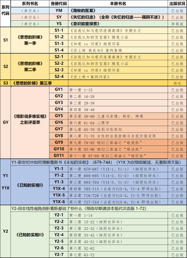 下面是按系列归纳的细雨著作出版一览表,每册的书名前都有唯一代码,在细雨社网站可用来快捷搜索。