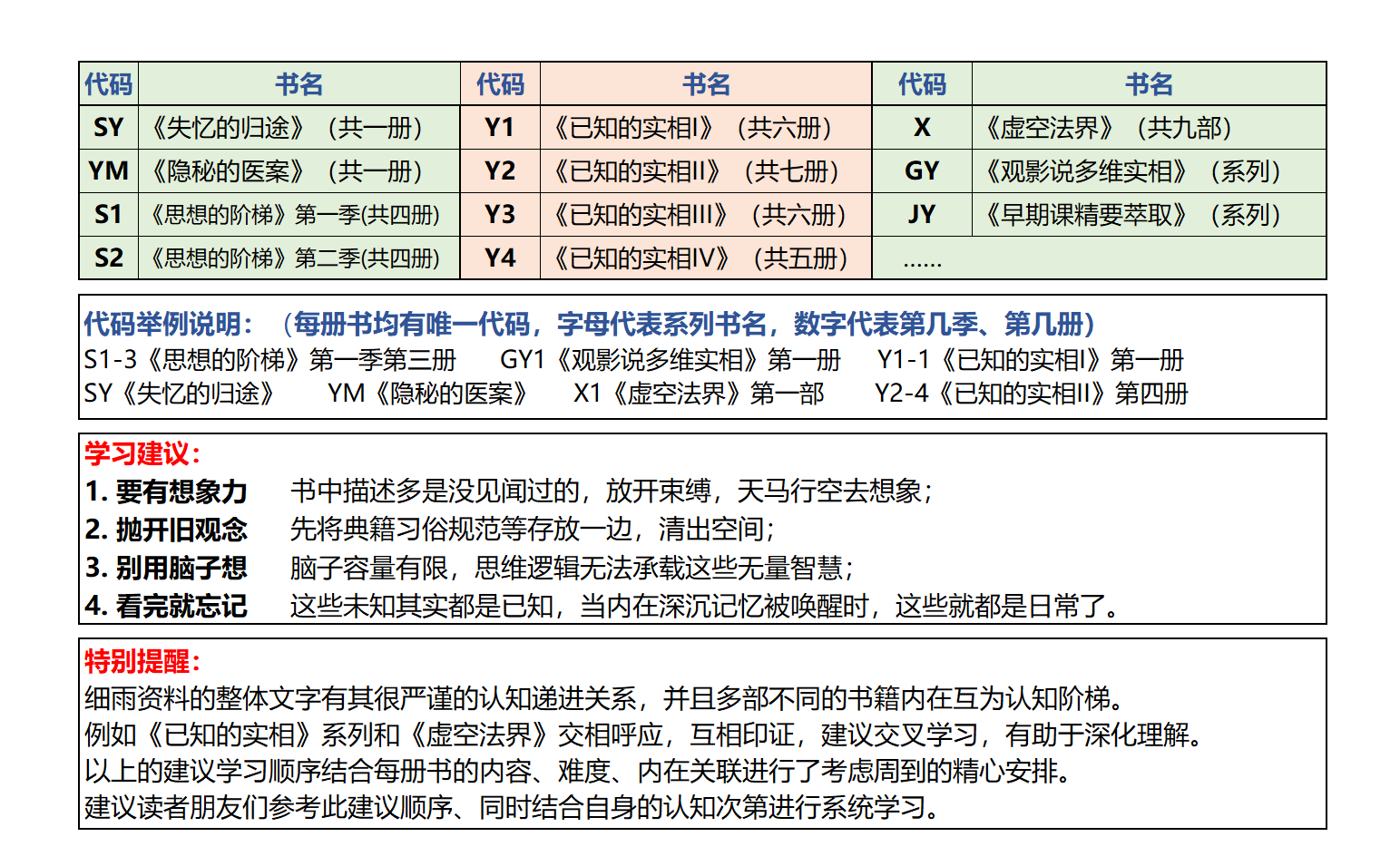 说明 | 本阶段阅读量多且密集, 是必要的筑基 | 建立新认知的必需基础 | 认知难度加大与深化,知识点建立与扩充 | 与高维沟通的信息,交换平台基本架构,修炼误区详解 | 观影写出自我知见,扩展识界,认知梦结构,消除执念 | 解析多重多元自我间的脉络道理与知行合一,多维自我间的整合经历演绎 | |||||||||||